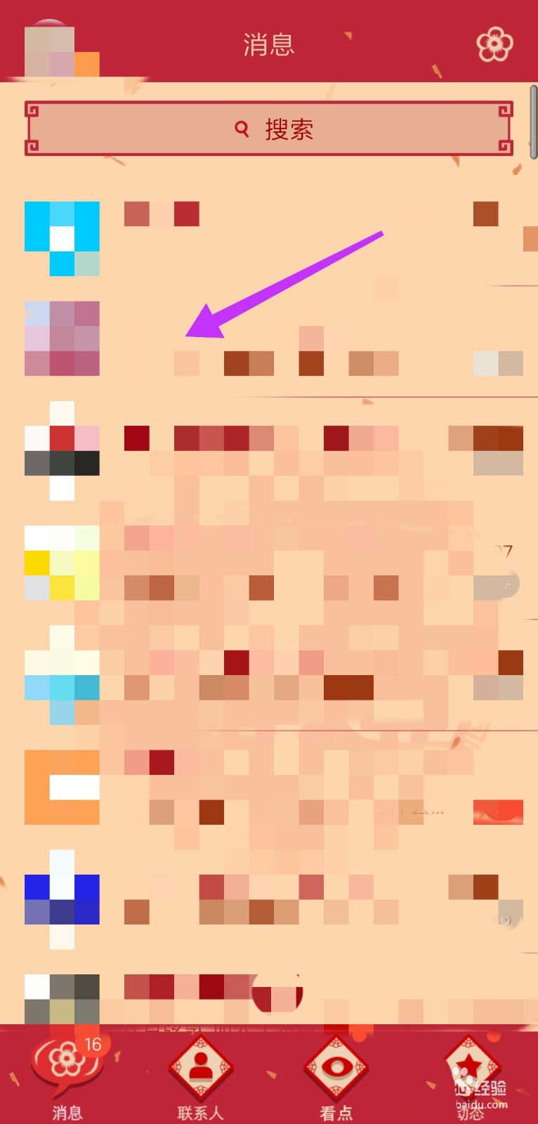 5、QQ消息主界面如下图所示,选择要分享的好友,此处以箭头处好友为例。