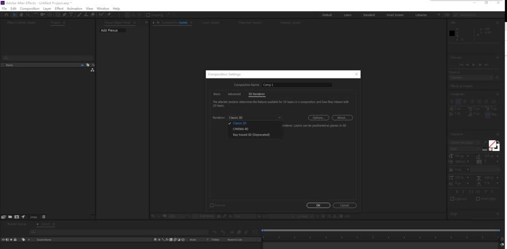2、在新建合成的对话框中,点击3D Renderer标题,在Renderer选项框里面选择 CINEMA 4D,点击OK!