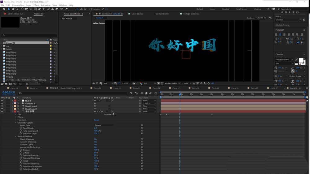 4、调整摄像机位置和灯光位置,以及灯光层颜色属性,亮度等信息。打开文字层属性,调节Extrusion Depth属性,打开Casts Shadows,调节Specular Intensit属性。一个使用AE自带的效果创建的三维文字就创建好了