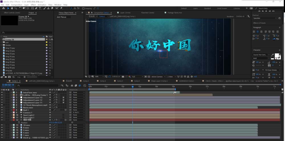 3、新建文字层,输入你好,中国!,调整好大小、位置。打开文字层的3d属性。新建一个空物体、一个摄像机,和灯光层,将摄像机父级连接到空物体上。