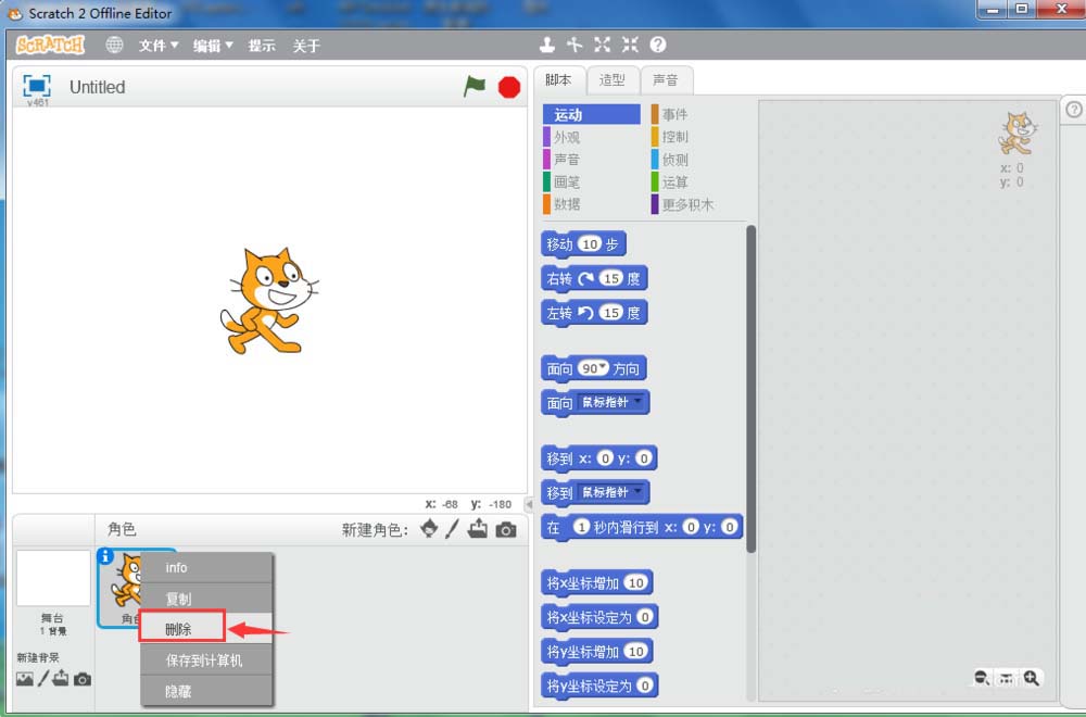 2、在小猫上按右键,点击删除,将小猫删除掉;