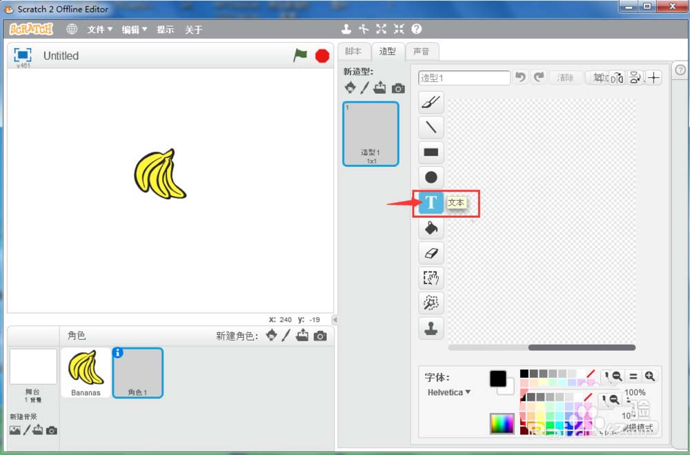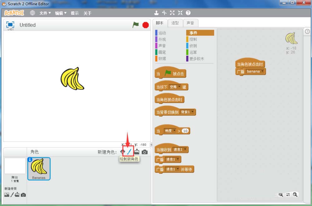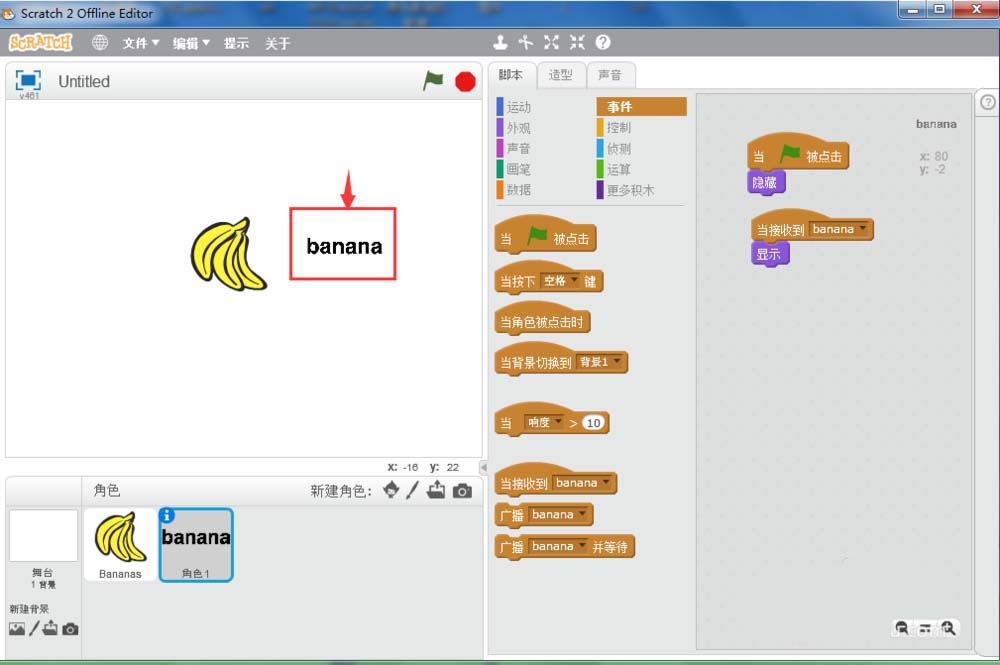 scratch怎么制作点击香蕉图片出现香蕉英文小程序?