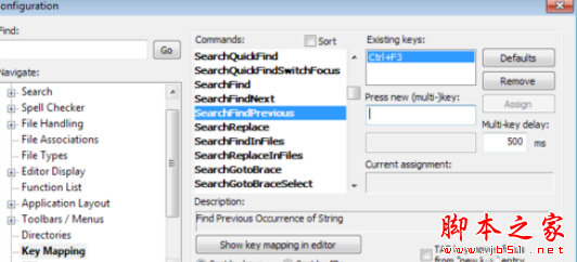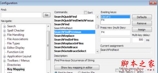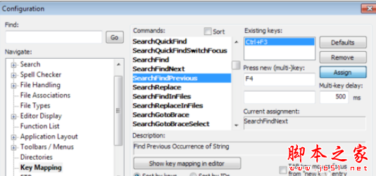 然后选中一个快捷键,比如 SearchFindPrevious(表示查找前一项)