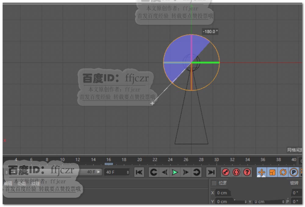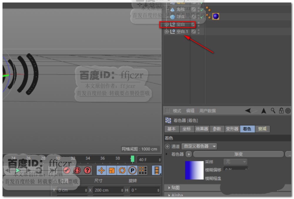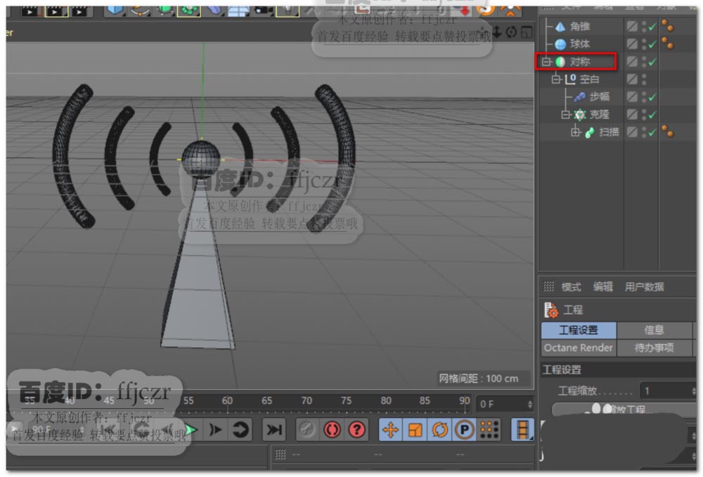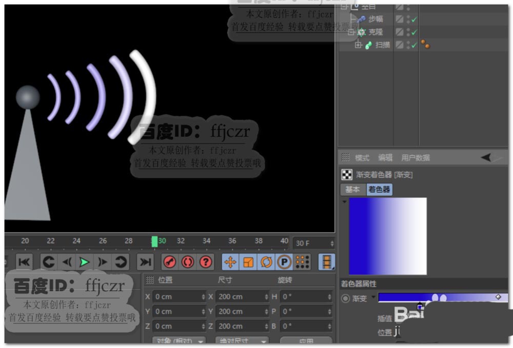 6、将通过克隆得到的右边信号模型(包括着色器、步幅效果器)放到一个空白对象中,复制空白对象;在正视图,将复制得到的空白对象旋转180度,使左边得到同样的信号模型。调整到合适的视角,点播放,即可得到WIFI标识信号动起来的动画。