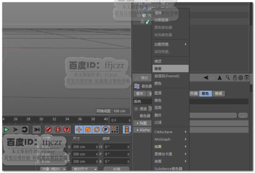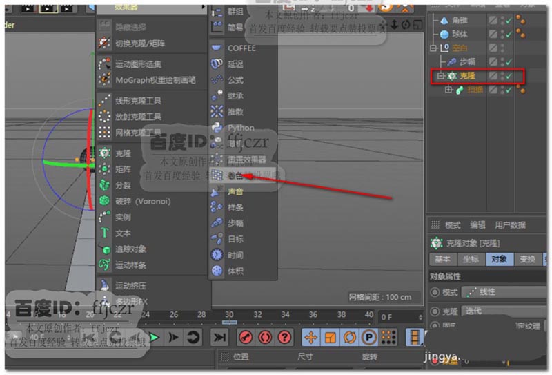 3、选中克隆组,点开运动图形菜单,选择效果器中的着色;修改着色器中的参数:位置、缩放、旋转全部取消,颜色模式选用开启,将使用Alpha/强度取消勾选。