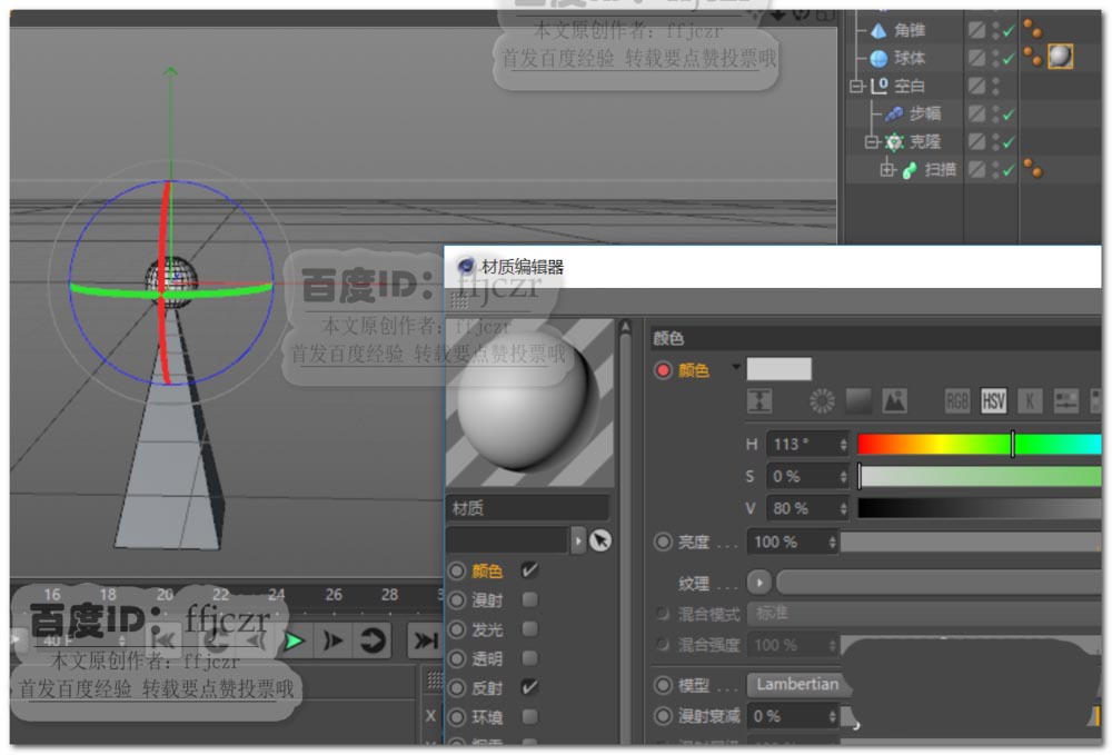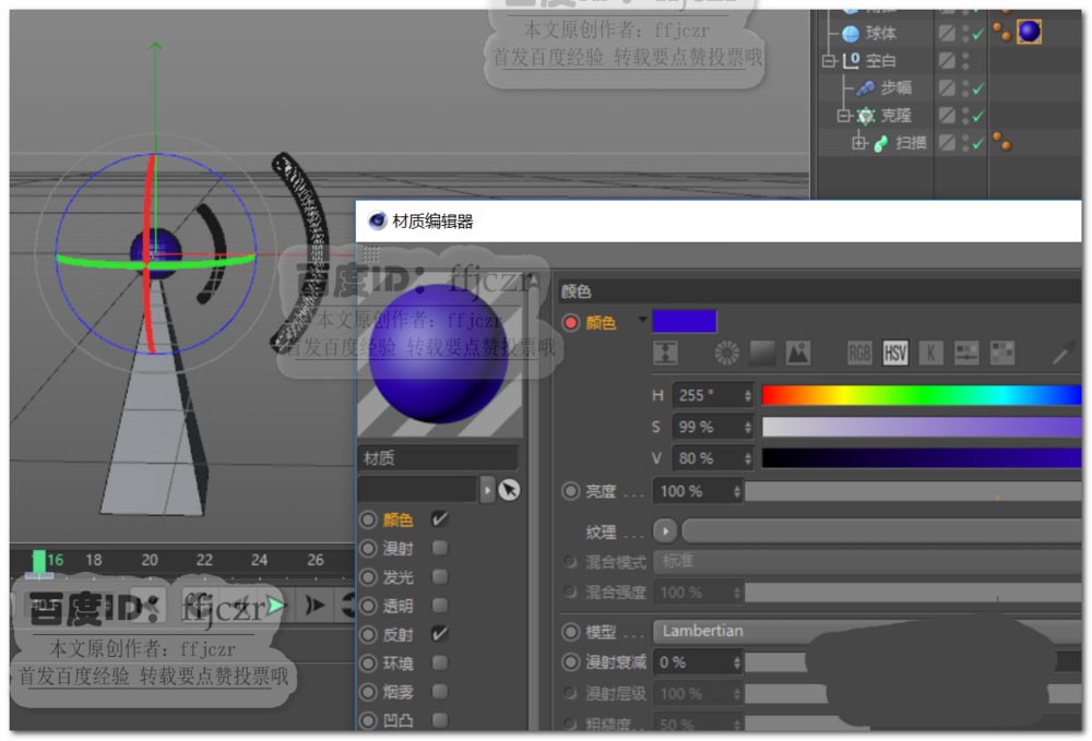5、给圆球添加变色动画。建一个材质,在颜色通道对颜色进行关键帧记录;在0帧时颜色选取白色;在16帧时颜色选取蓝色。点播放,可以得到圆球在0到16帧变更颜色的动画。