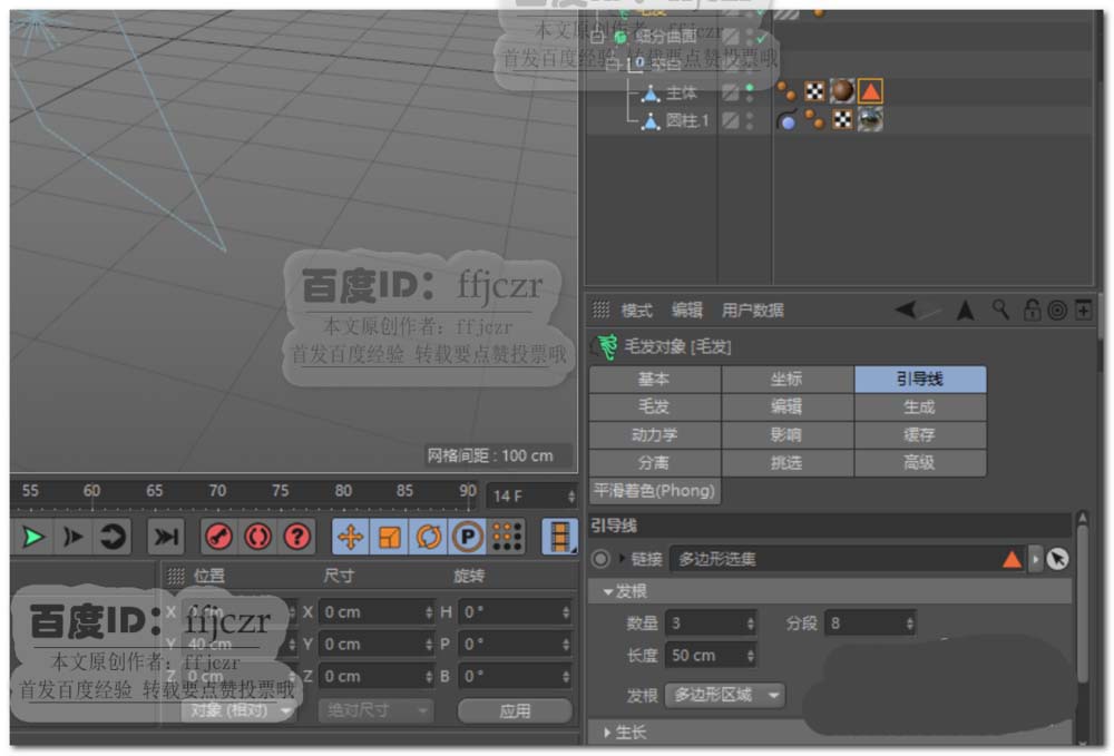 6、选中圆柱体上端面,给选中的面添毛发;在毛发标签引导线属性中发根的数量为3,分段为8,长度为50,发根的分布为多边形区域。