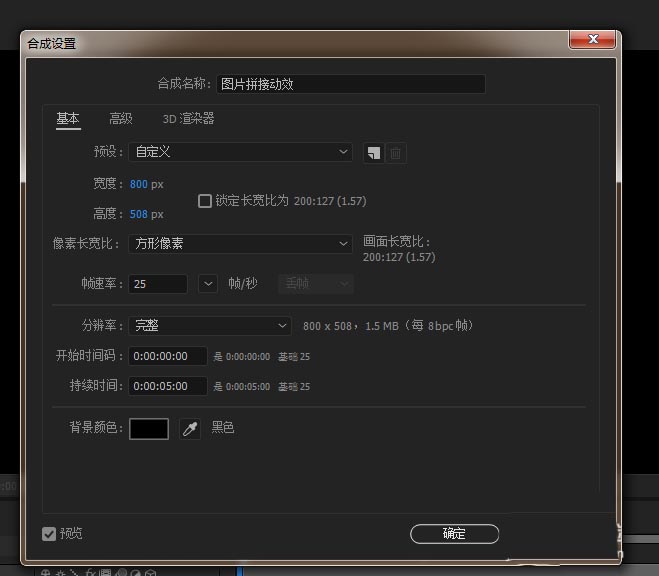 1、打开AE软件,新建合成,命名图片拼接动效,调整相应的参数。