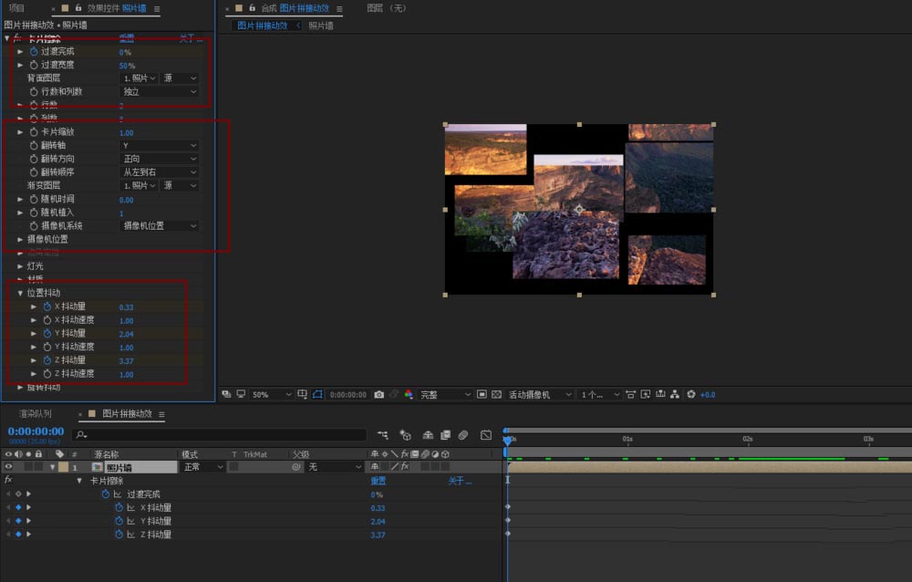 5、选中预合成,添加卡片擦除效果;设置参数;给位置抖动和过渡完成K关键帧,实现动画;