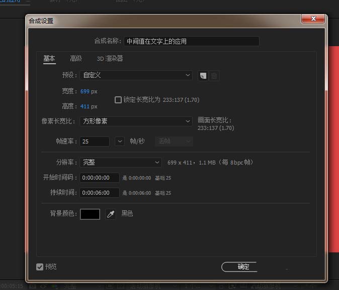 1、打开AE软件,命名中间值在文字上的应用,调整相应的参数。