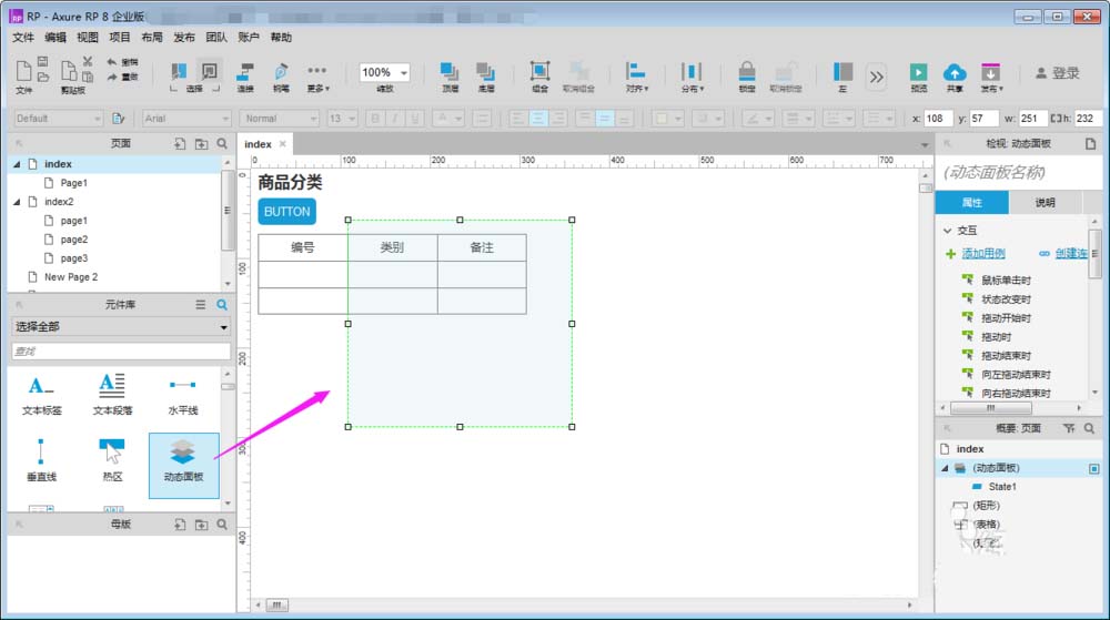 2、从左侧元件库拖取一个【动态面板】元件到页面;