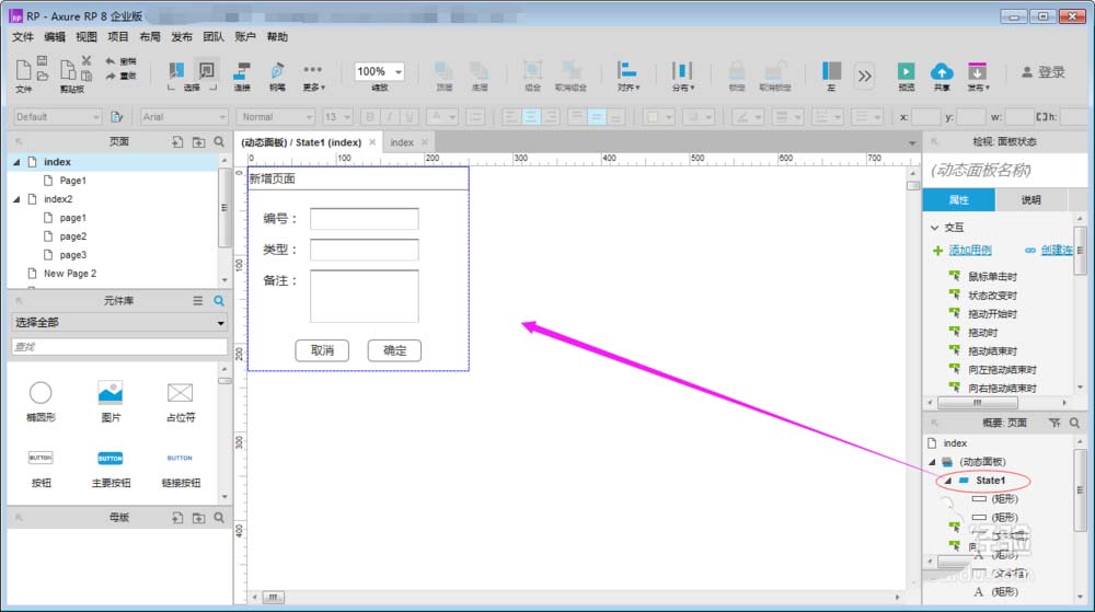 6、进入【State1】,设置【取消】按钮的事件为:隐藏【动态面板】,如图