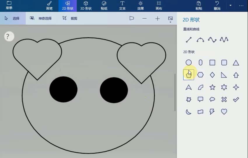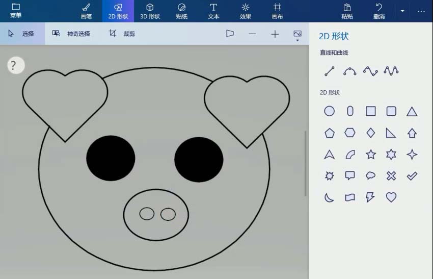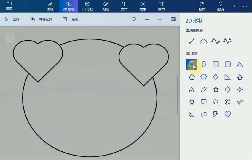 1、打开画图3D应用,选择菜单上的2D形状,单击圆形工具,画一个圆形作为猪的头,接着画两个相同心形,作为猪的耳朵,擦掉多余的线条。