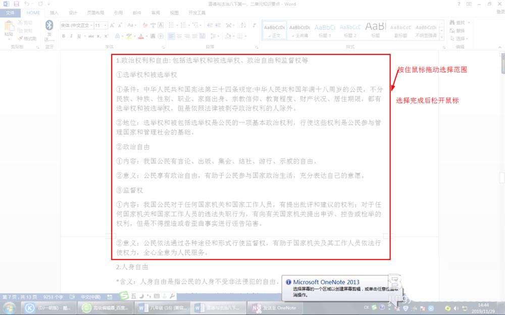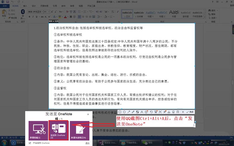 5、Tips:OneNote的截图只复制当前页面的图片内容,如果使用QQ或360浏览器的截图,你截图一点word文档内容,发送到OneNote笔记时是整个文档内容都复制了。如使用QQ截图Ctrl+Alt+A后,点击“发送至OneNote”。