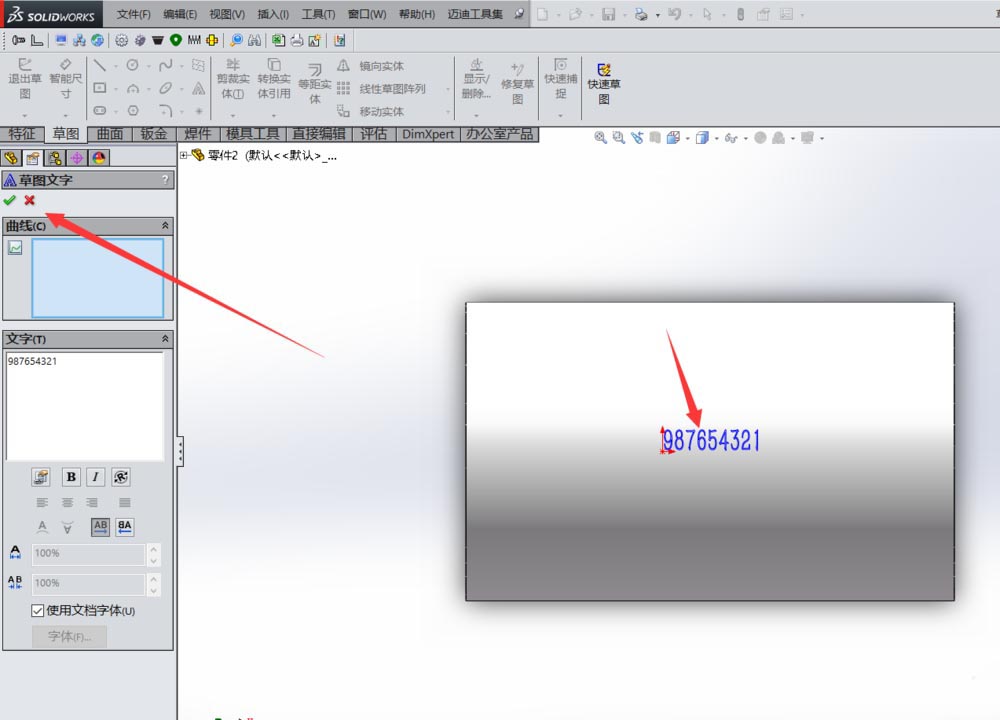 4、然后在草图上输入文字,文字输入好之后退出草图