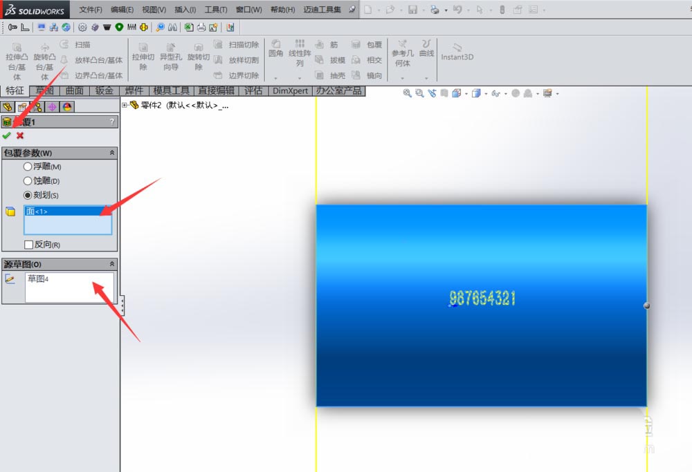 5、之后我们选中草图,在选择特征里面的包覆指令