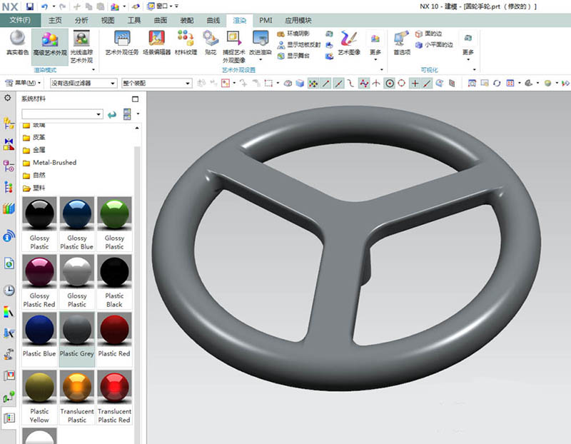 20、如下图所示,标题栏中点击渲染,工具栏中点击“高级艺术外观”,指定一种颜色效果给实体。至此,简单的圆轮手轮建模并渲染完成。