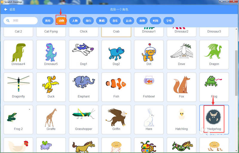 4、进入选择一个角色页面中,在动物类别找到并点击刺猬;