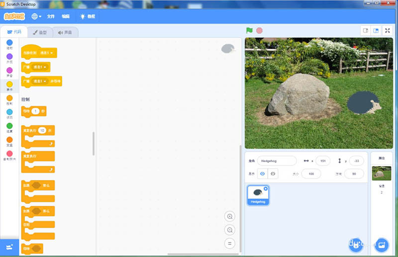 8、我们就在scratch中创建好了一个石头花园中的刺猬场景。
