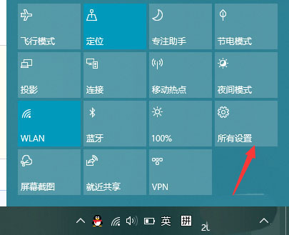 1、确认笔记本已经连接了鼠标,否则有可能出现关闭触摸板后而无法操作电脑的情况,点击右下角的通知栏,选择所有设置⚙