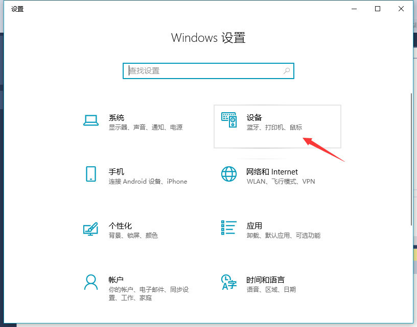 2、在弹出的设置界面中,找到设备(蓝牙、打印机、鼠标),进入与触摸板相关的设置界面