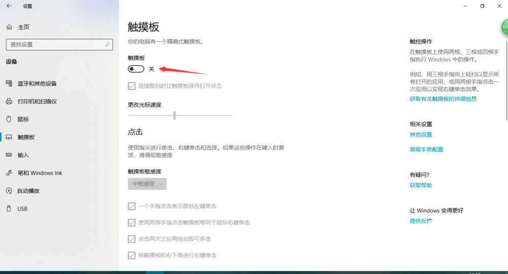 4、确认这里显示了“你的电脑有一个精确式触摸板”,然后取消下方触摸板打开的选项,即可关闭触摸板