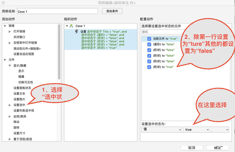 7、选中星形最多的一行,在属性栏中点击“鼠标单击时”,并在弹出的对话框中,选择“选中状态”,除最多的一行设置为“ture”其他的都设置为“fales”(如图)。