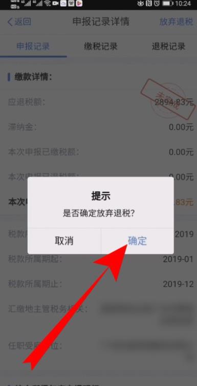 5、页面弹出放弃退税提示,点击确定。