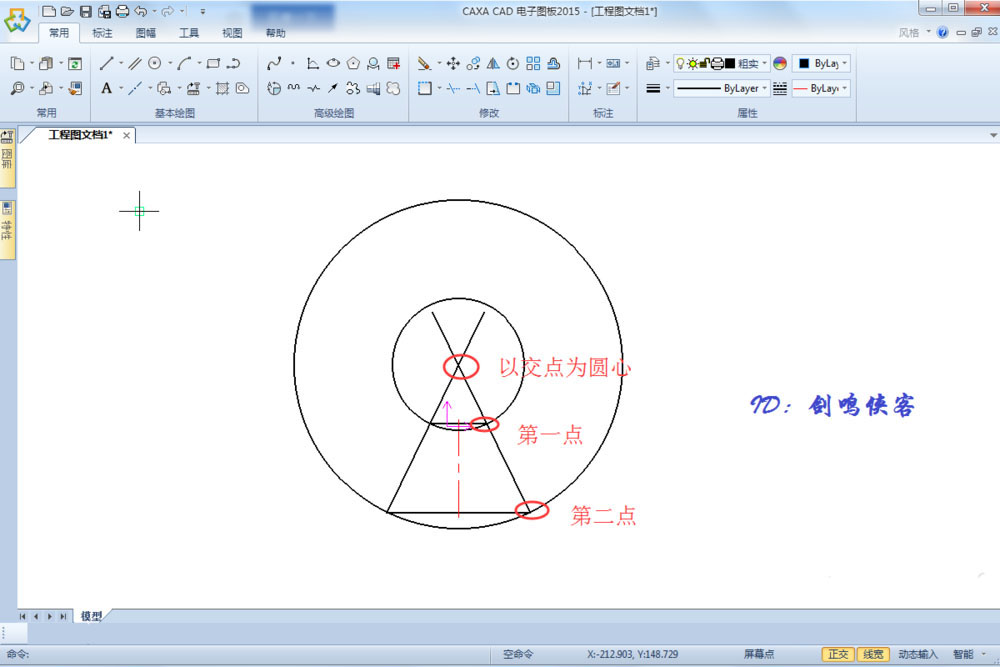 3、以上一步中得到的交点为圆心,分别以该交点至圆台一条母线的两个端点为半径,做两个同心圆,则圆台展开的扇形面就在这两个同心圆得到的圆环上。因为圆台展开是以母线为基础进行的。