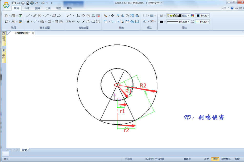 4、分别量出上一步中画出的两个圆的半径,小圆半径为R1,大圆半径为R2。同时,量出圆台上下圆面的半径,上面的小圆半径为r1,下部大圆半径为r2。我们知道,圆台展开后的圆弧长为l=θ*r,其中θ为展开角,l1=θ*R1,l2=θ*R2。而圆台展开后扇形的弧长就是圆台上下圆面的周长,l1=2π*r1,l2=2π*r2,则可以求出展开角θ=2π*r1/R1=2π*r2/R2,单位是弧度,化为度,则θ=360*r1/R1=360*r2/R2。根据此公式,结合量出的尺寸,求出展开角θ。