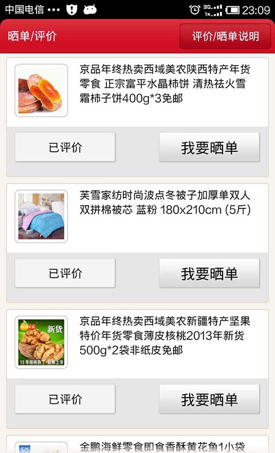 4、进入后,会看到自己购物的列表。点击一下没有晒单的物品后面的我要晒单,进入。