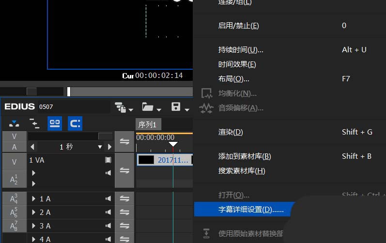 4、选择时间线上的创建的字幕文件,右键选择字幕详细设置;