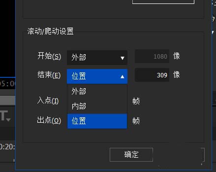 5、选择滚动爬动选项里的结束选项,选择为位置,设置最末尾要进行停留片刻的像素参数数值,在出点设置末尾字幕要停留的帧数即可;