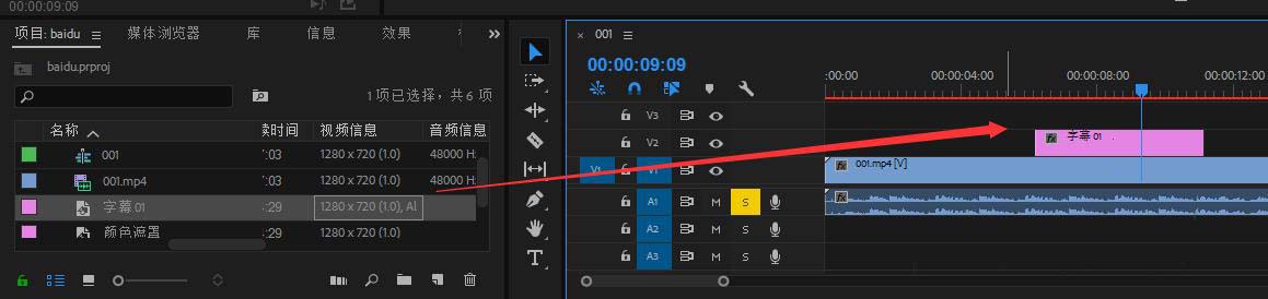 2、项目中会生成刚创建的字幕,并将其拖至视频的上方,如下图所示: