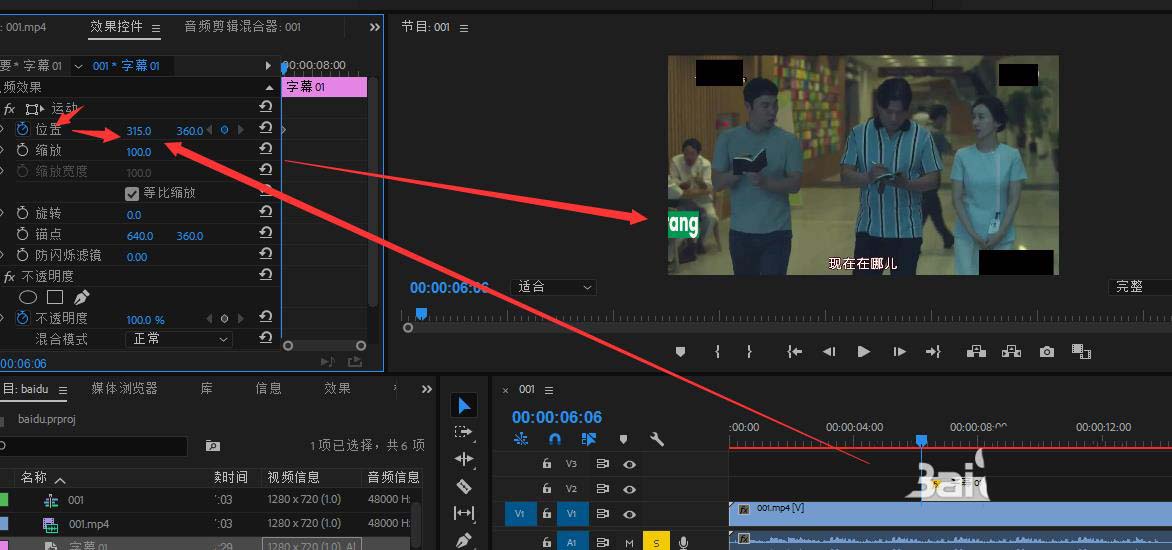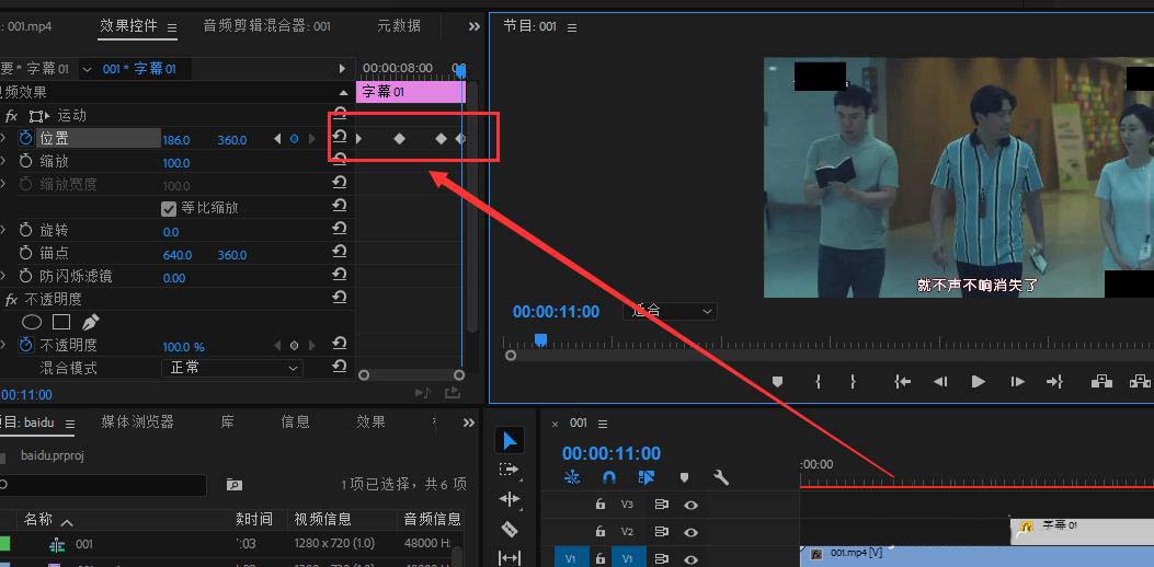 1、最后在效果控件下的运动选项中,位置移动到视频外,并创建关键帧,如下图所示: