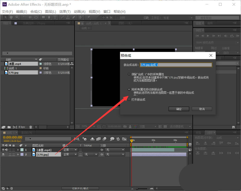 1、打开ae,新建合成项目,导入水墨素材和照片