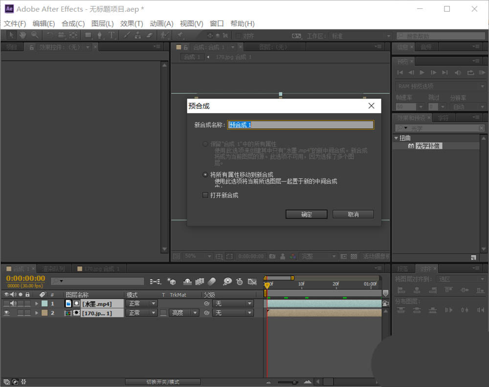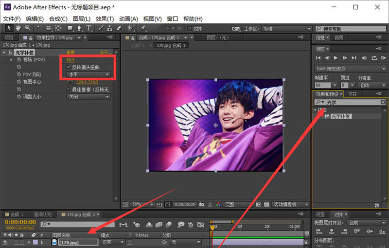 4、双击人物照片图层——打开预合成——添加一个光学补偿。找到后,鼠标点中效果不松手,直接拖动效果到图层上,水墨滴落,水面或者说平面会有一个涟漪的扭曲效果,这里的光学补偿就是为了添加一个这样的物理现象