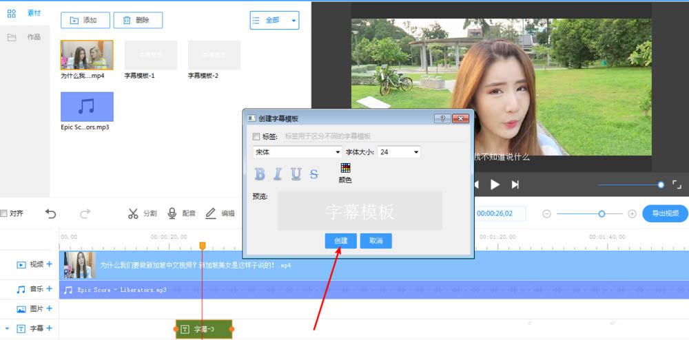 3、点击【字幕】图标,弹出创建字幕模板窗口,点击【创建】