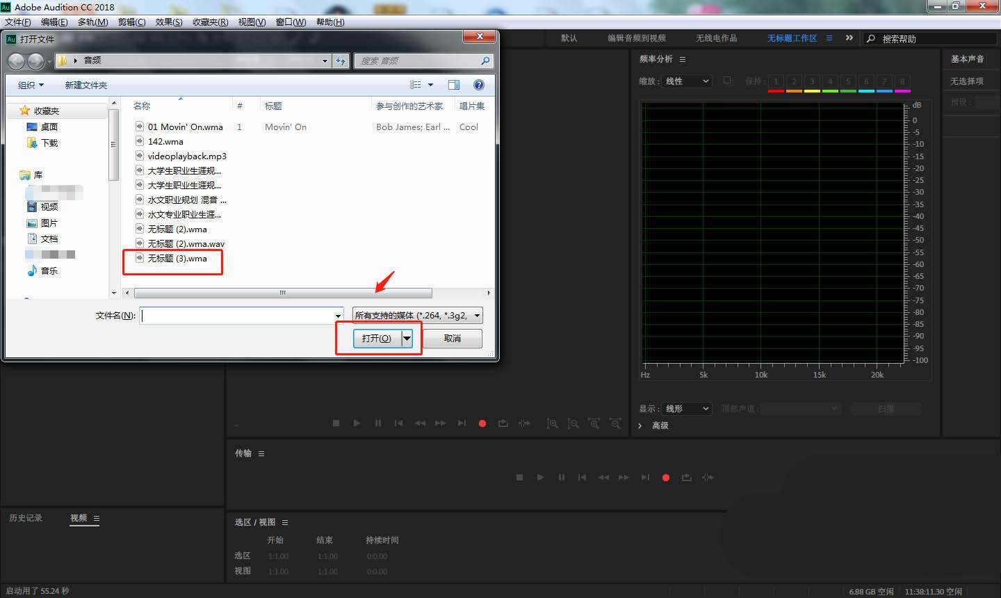 2、在弹出的导入文件窗口中,选择需要的音频文件,然后点击打开。
