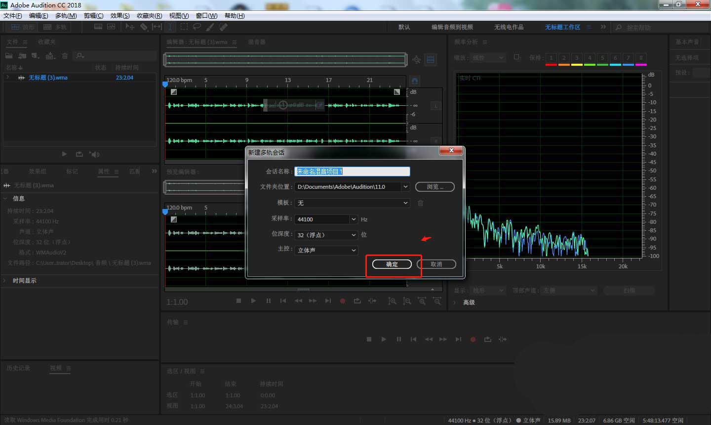 5、在弹出的新建多轨会话窗口中设置参数,然后点击确定。