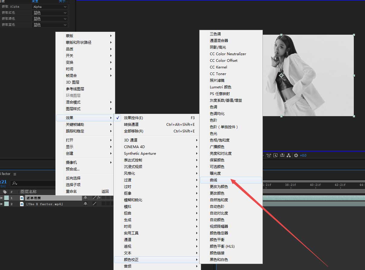 5、为了使视频中图像与背景的对比更加明显。选中“遮罩视频”右键效果——颜色校正——曲线,调整曲线,让主体尽量向黑色靠拢。拉开与背景颜色的区别。如图所示。