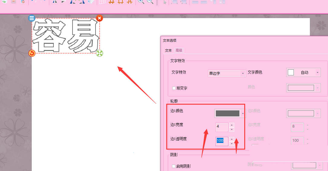7、然后在下方轮廓栏中更改边1的颜色、宽度以及透明度,得到如图的空心效果