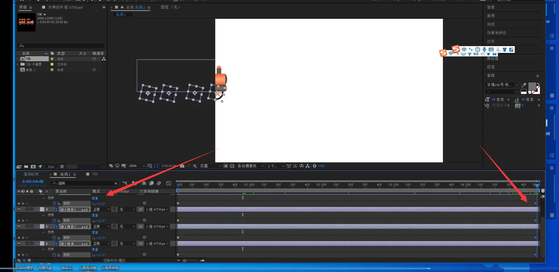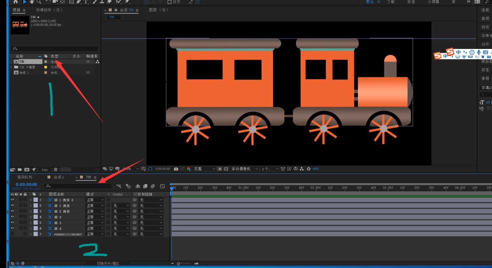 4、在合成1里面选中所有汽车轮子图层父子连接到车身,(如图)鼠标拉一下,也可以自己选。