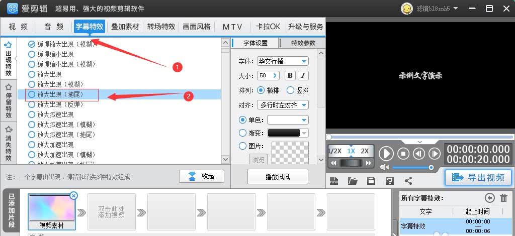 爱剪辑视频字幕怎么制作拖尾放大出现特效?