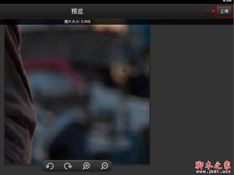 第五步:选中了图片之后,手机qq软件会预览一下图片并允许你上下左右调节。默认状态下请不要进行任何拖动操作,直接点“上传”就行,否则图片会错位。