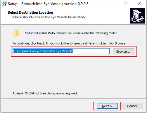 2、打开单机版文件“Retouch4me Eye Vessels 0.9.9.3.exe”。选择软件安装位置,推荐为默认安装位置;