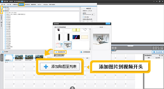 选中导入视频的缩略图,此时进度条已经定位到视频开头处。点击“叠加素材”-“加贴图”,双击视频预览框,在弹出的“选择贴图”对话框中,点击左下角的“添加贴图至列表”按钮,导入准备好的图片,即可将图片添加到视频开头的位置。