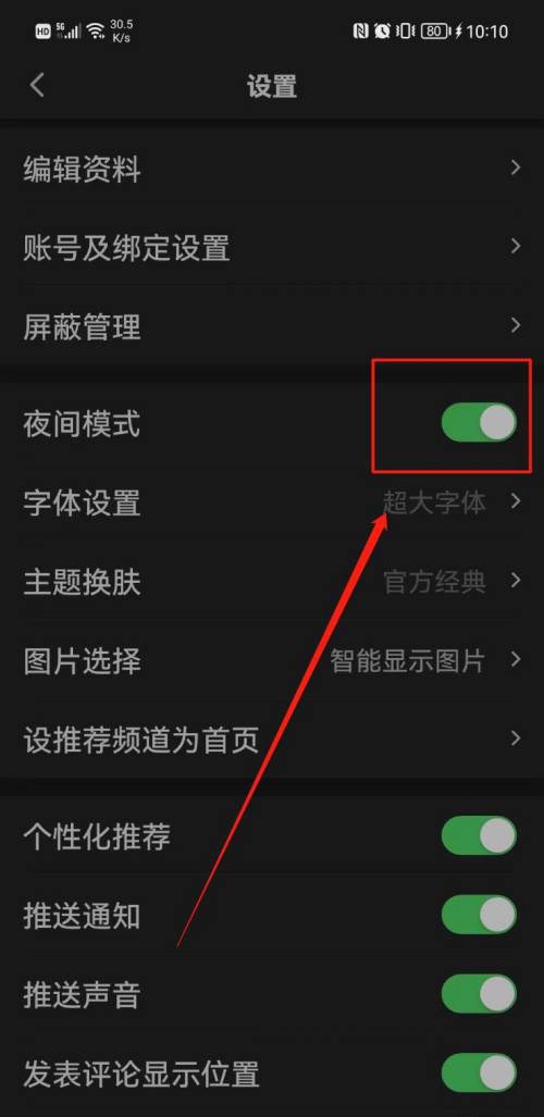 第三步:点击【夜间模式】后的绿色按钮,待显示绿色即可开启,详见下图所示.