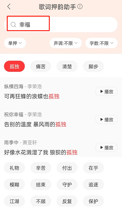 使用该功能后,您就可以快速完成歌词押韵啦,自由音乐创作者再也不用担心没有作词灵感啦!