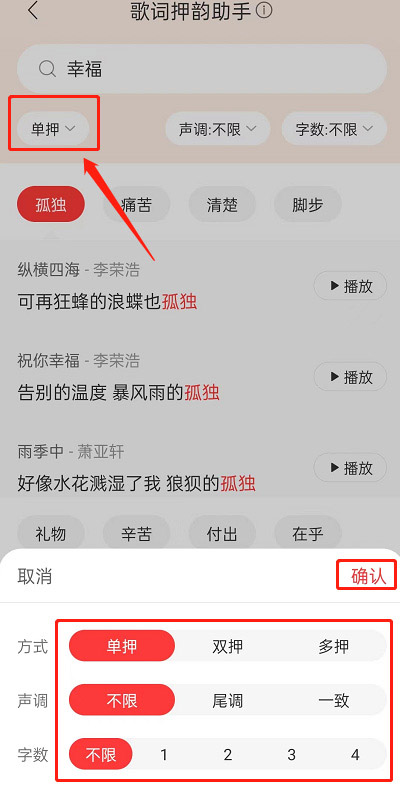 4、点击单押,选择押韵方式、声调、字数,即可筛选到合适的词汇。